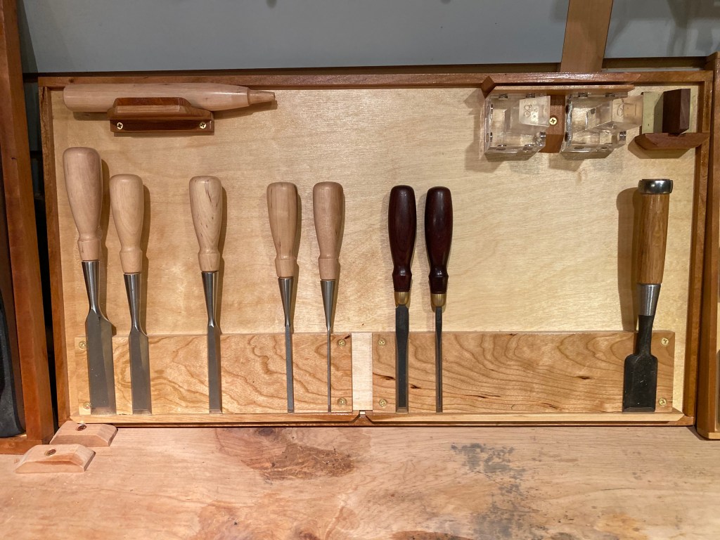 Went a little further with this idea, and modified it to be more “layered”. Also built two more boards, one for chisels and one for saws.