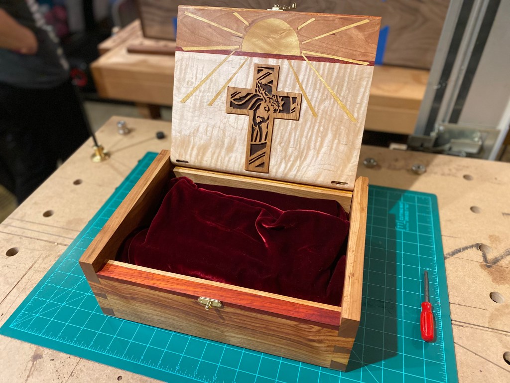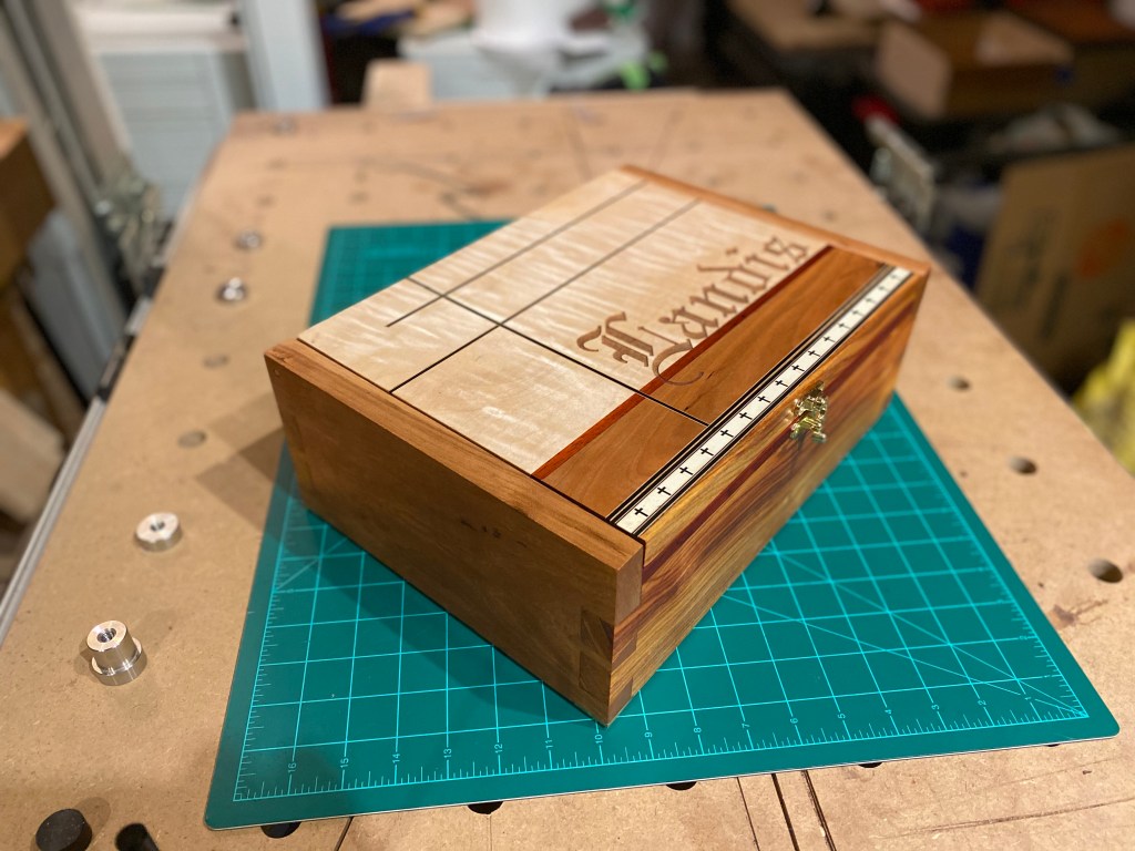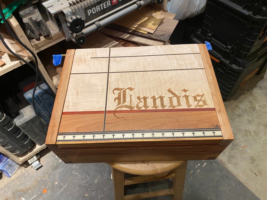 The next step was to add a bit of “Heirloom” to it, and we opted to go with getting the lid laser etched. Thanks to Tony over at Beran Laser Engraving & Woodworking.