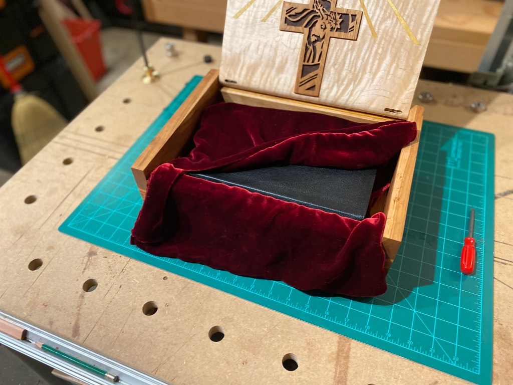 And now we’re closing in on done. We finished the box and lid using four coats of Danish Oil. We also added a nice velvet sash to wrap the Bible in, and a nice velvet wrapped pad for the bottom of the box.