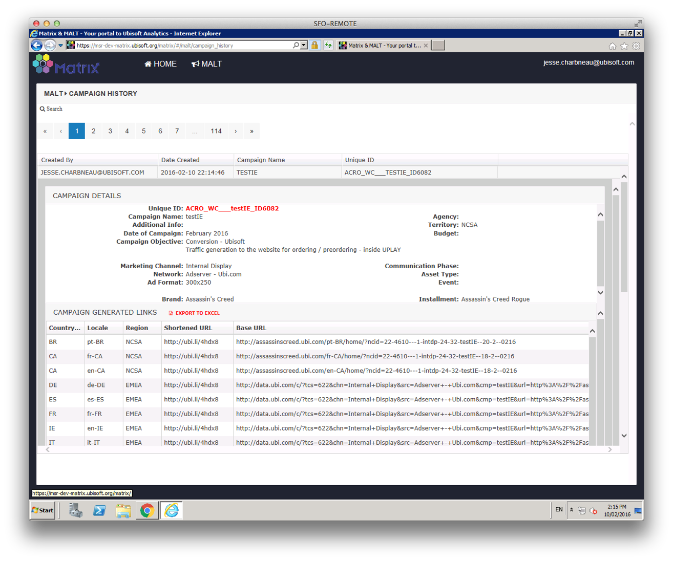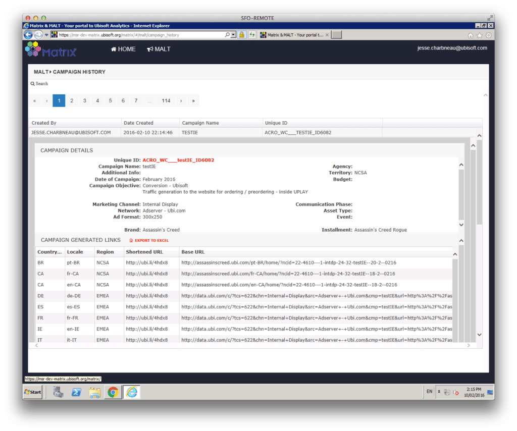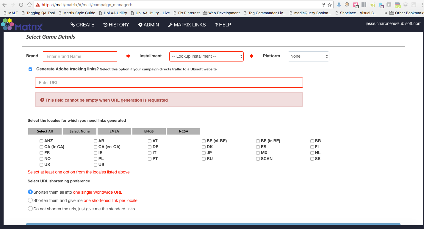 Malt (or Marketing Analytics Link Tracker) was a tool I developed while working at Ubisoft. It allowed us to simplify the creation of Marketing campaigns, using many different channels. The Malt application tooling was built to enhance the idea of a singular Marketing tool, that would allow link generation and meta data alignment across the global organization. It integrated meta details into links that where then simplified with TinyURL and provided to brand marketing managers for distribution to international and domestic Ad partners. These links, when used in conjunction with event capture using Adobe Analytics. The backend of the integration pulled in the data from Adobe, cataloged and flattened in preparation for ETL (Vertica backend).
