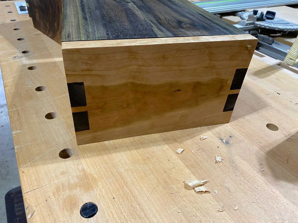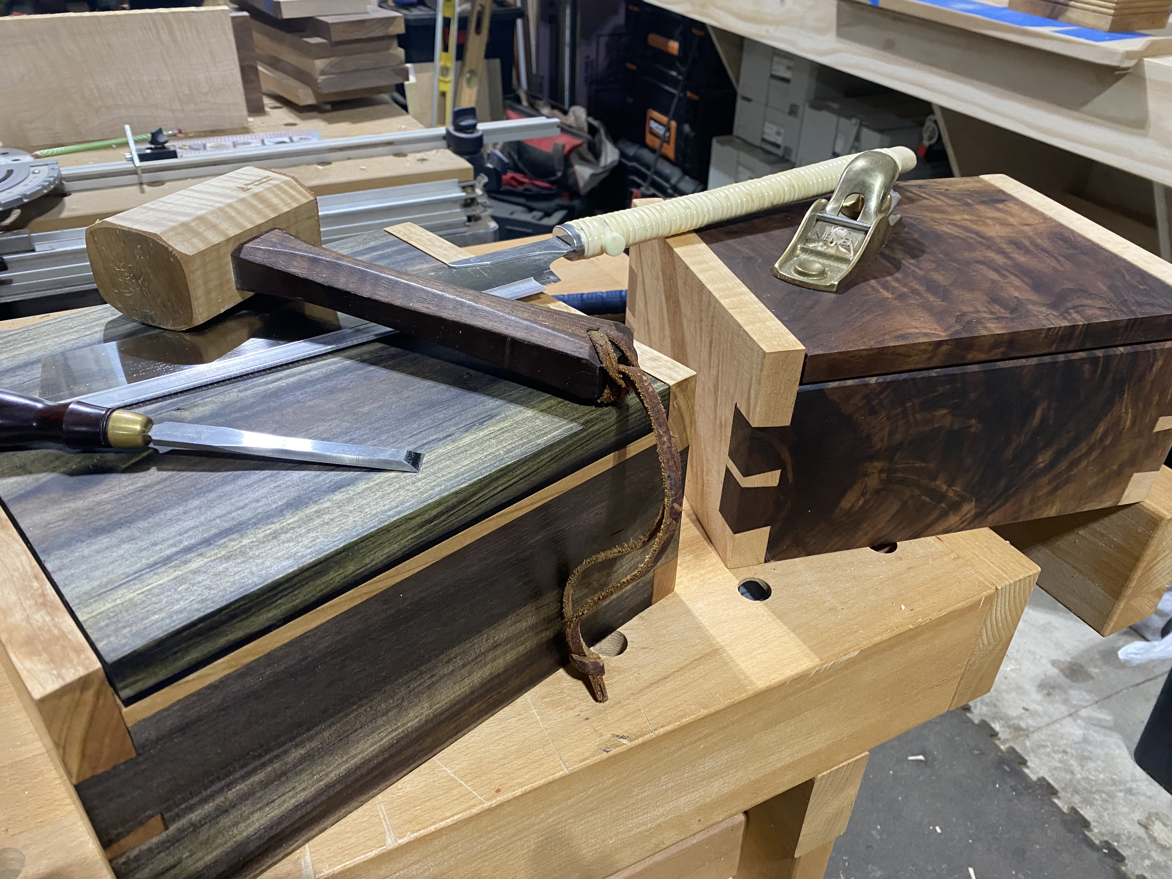 Made myself a Bible box, shown below with a nice hand carved comfort bird :-). Made from Figured Cherry and Blue Mahoe, and a little bit of Ebony to accent it.