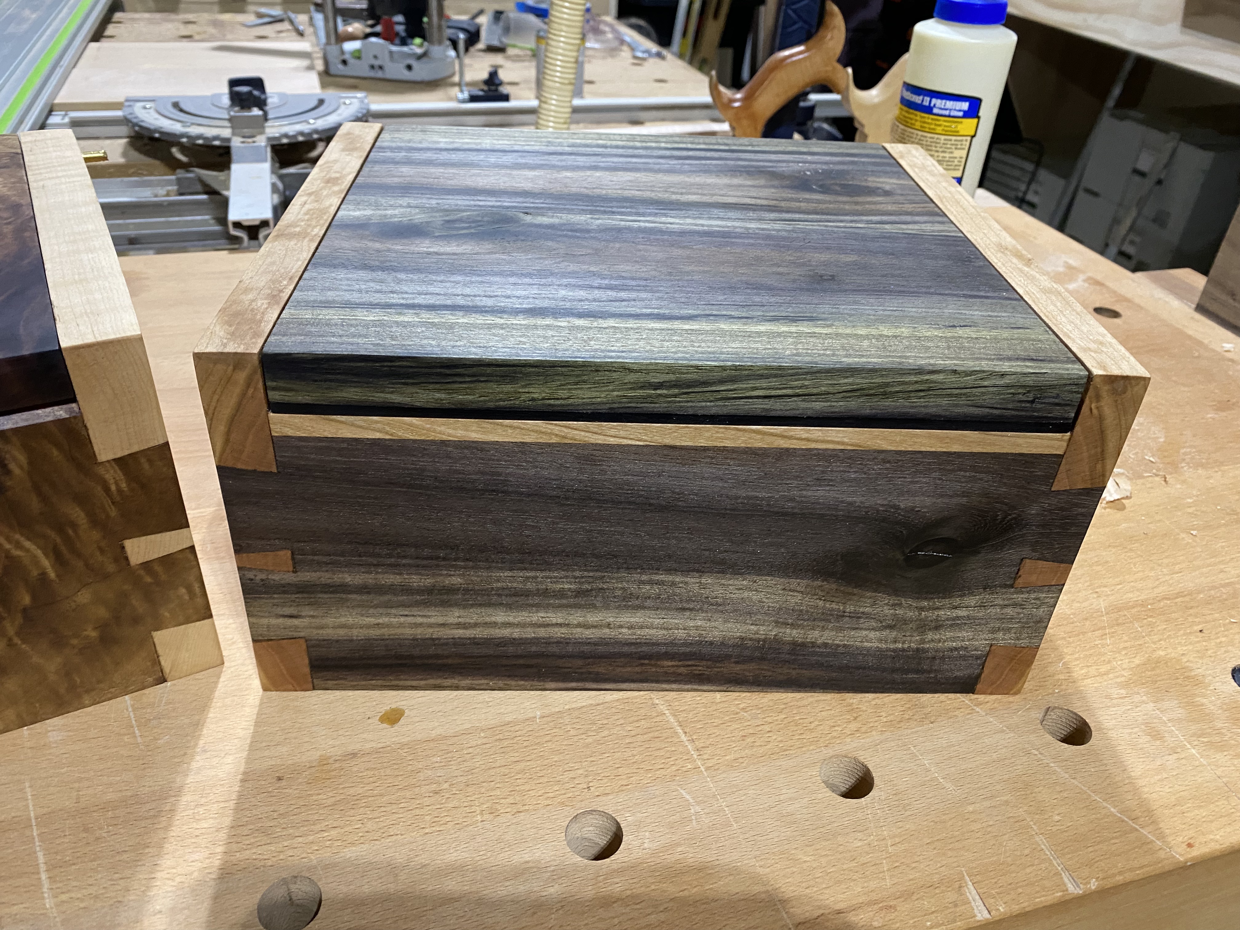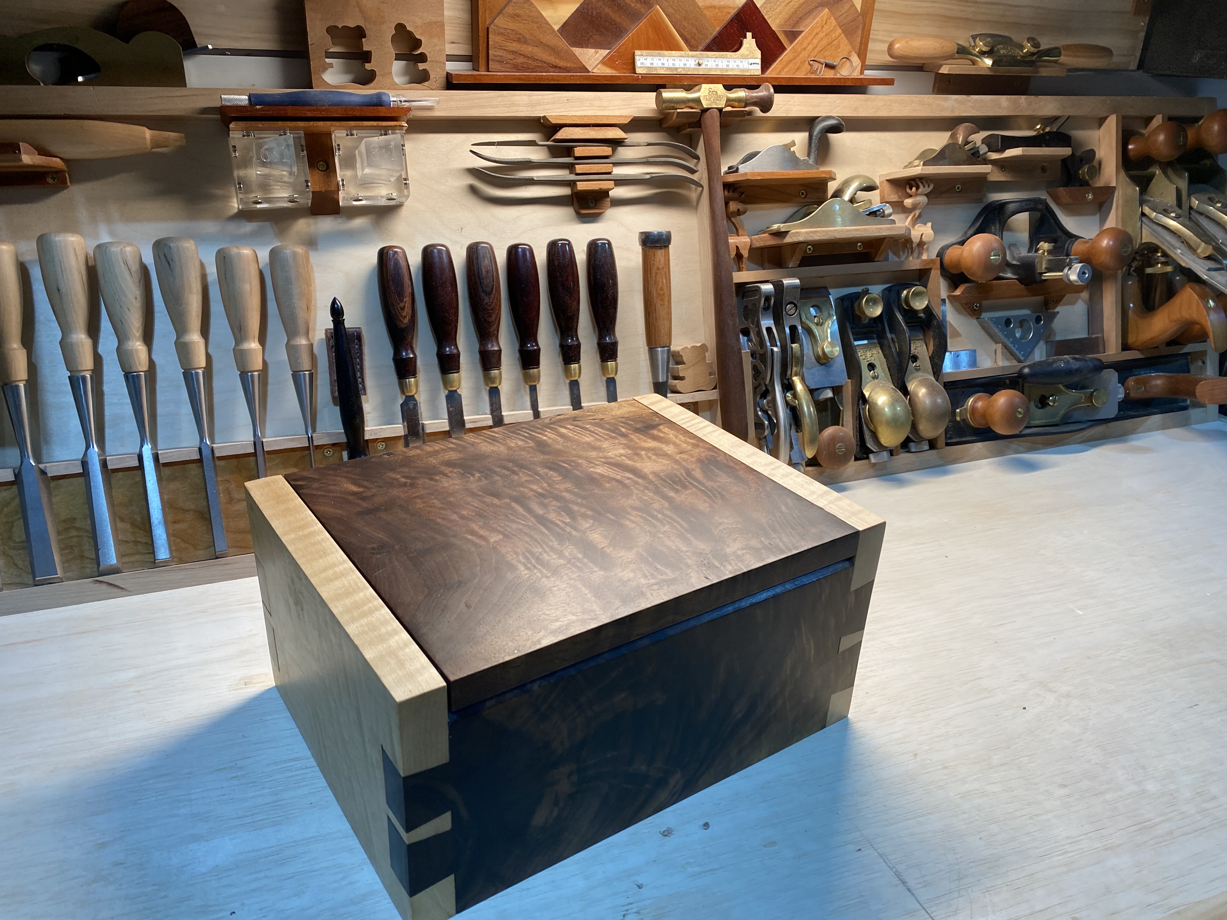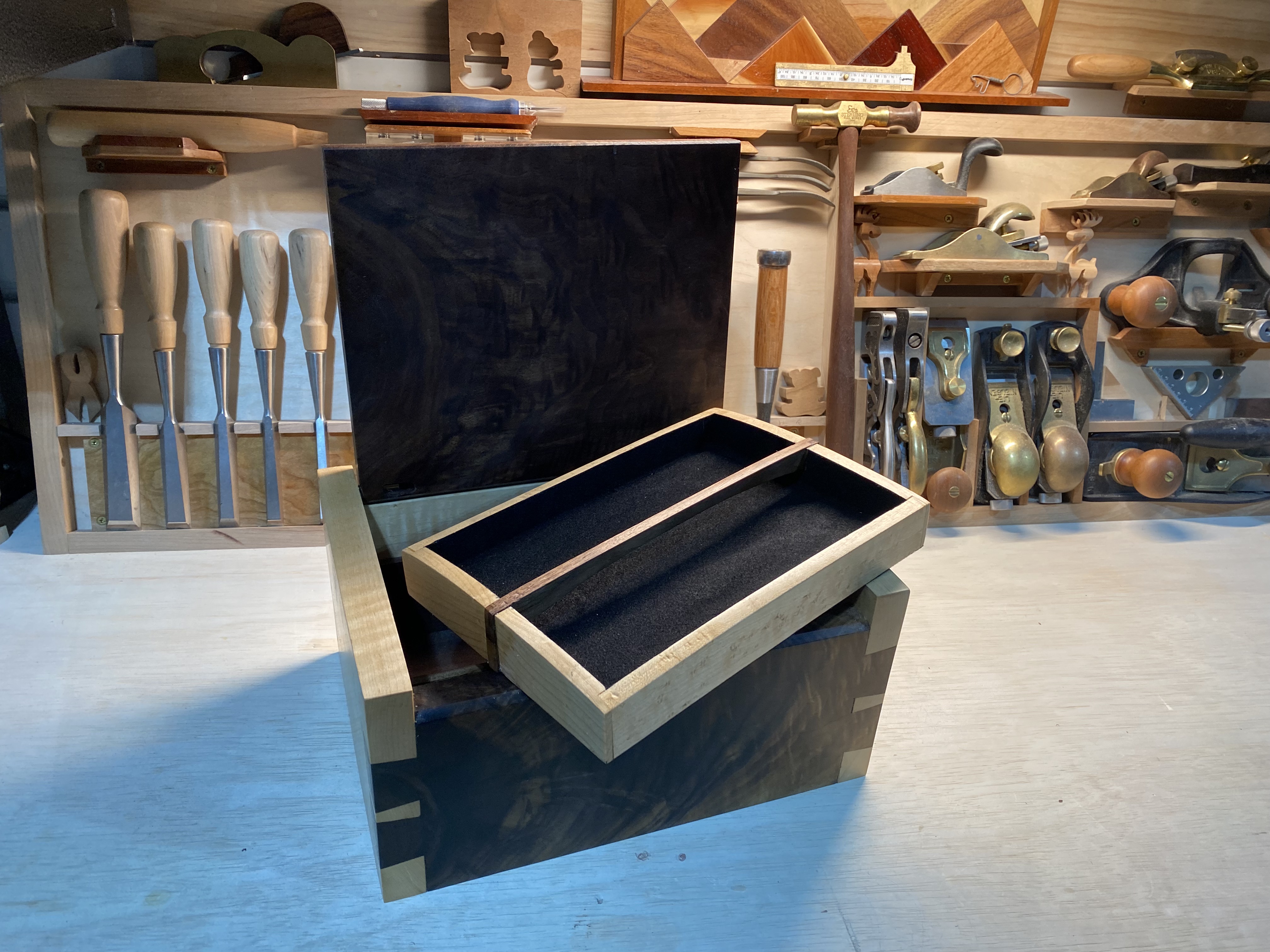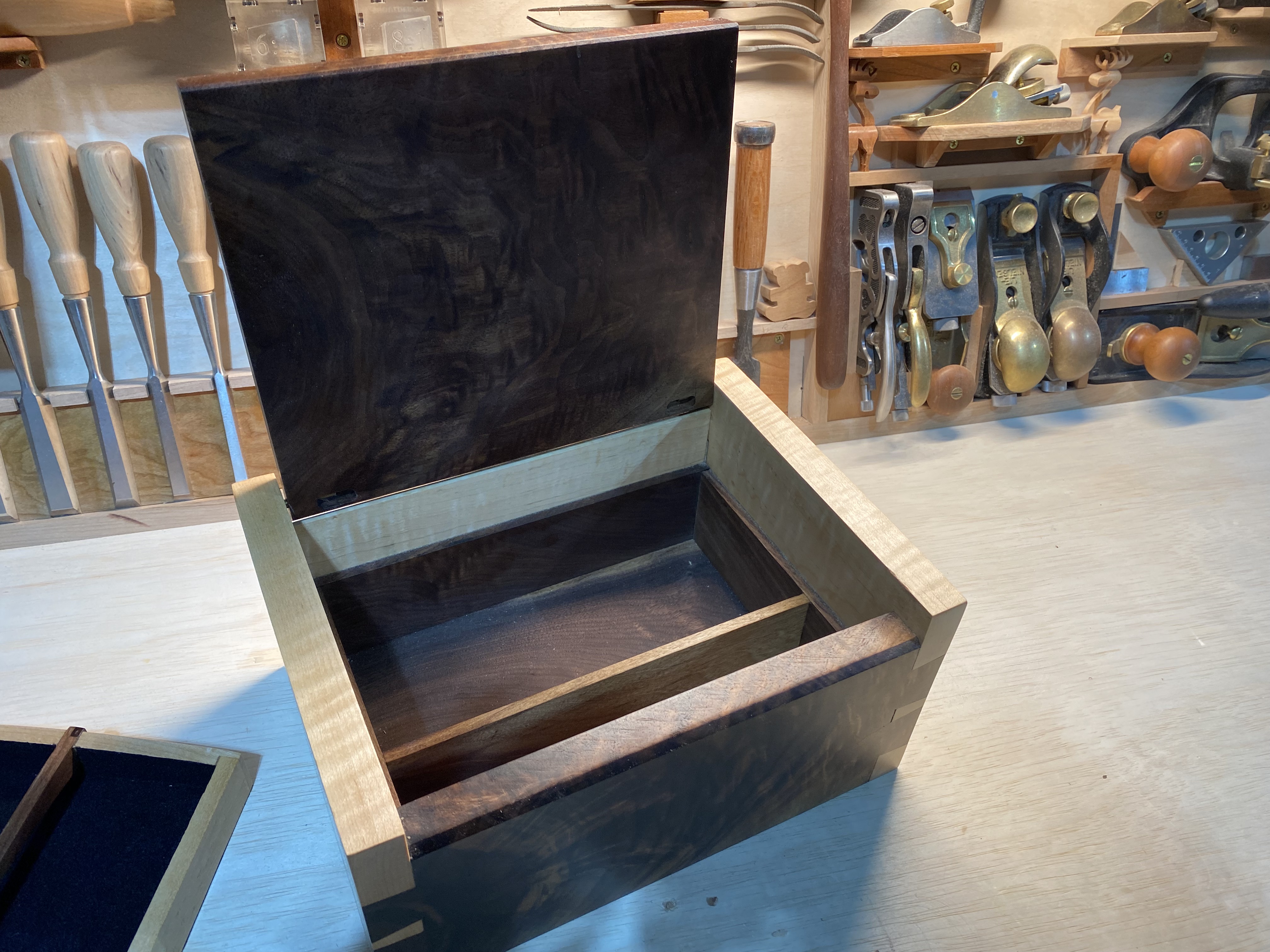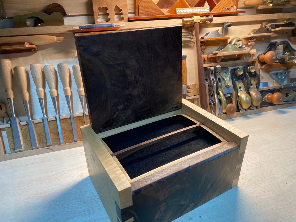 And a nice little box with a tray for Kim to stash her fashion jewelry and knick-knacks, also showing the replacement to the organization board 🙂 – Made using figured Maple, and some highly figured Crotch Walnut.